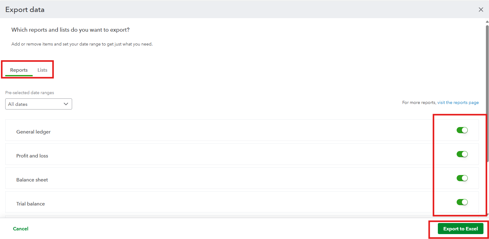 To learn more about the reports and lists that can be exported, check out this article: Export your QuickBooks Online data.