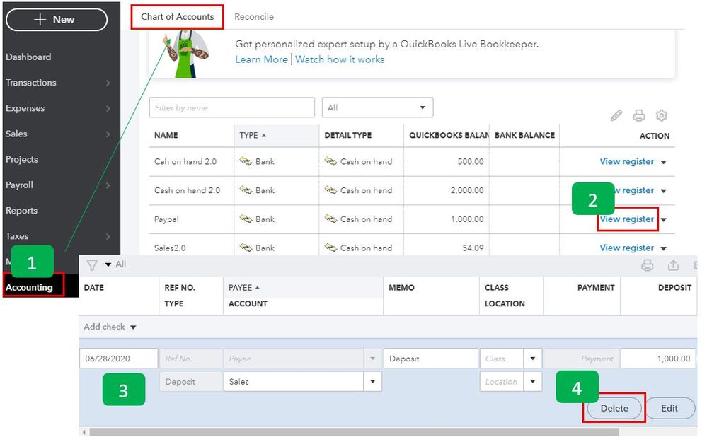 The first thing that we have to do is to delete the transaction in the Chart of Accounts page so it will go back to the banking tab. I'll show you how: