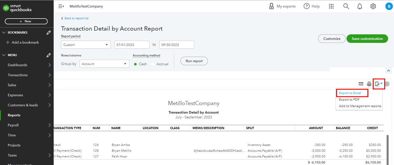 As a workaround, we can export it to Excel. There, you can customize the report and arrange it according to your preference. To do this, click the Export in the report you pulled up, then select Export to Excel.