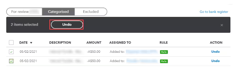 - A black box will appear at the top of all transactions, showing how many are selected. Select Undo. This will move them over to the For Review tab.