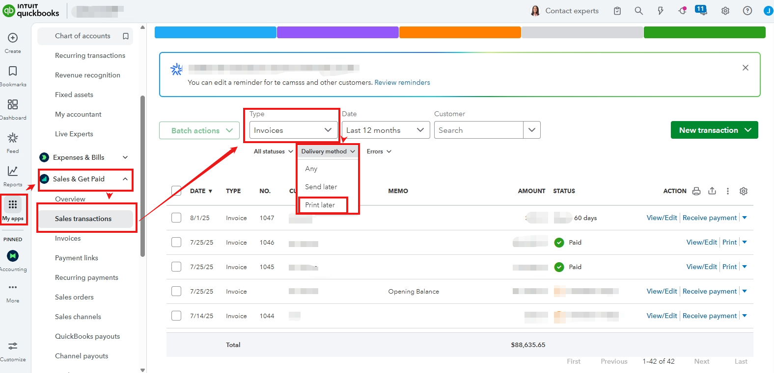 Next, ensure you are using a supported browser for optimal performance with QuickBooks. After that, return to the sales section and select the delivery method to filter for Print later.