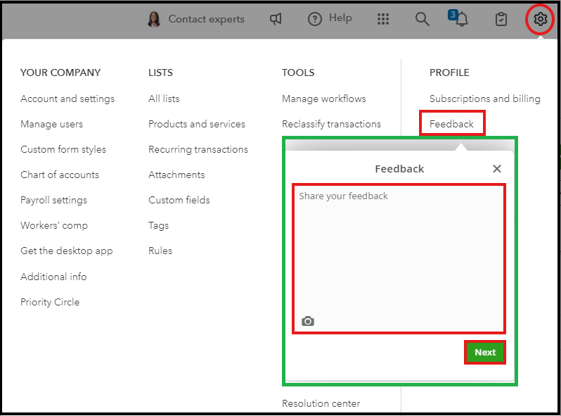 - Select the Gear icon, then select Feedback.