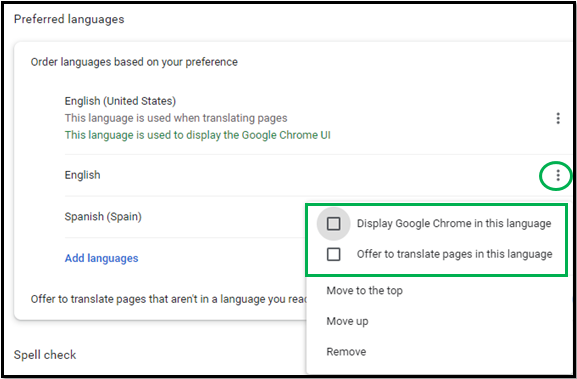 - Select the vertical ellipsis ⋮ next to the language, and then Display Google Chrome in this language checkbox.