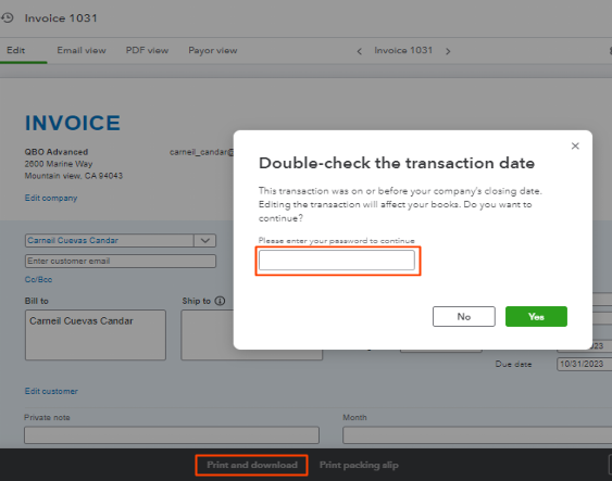 Alternatively, you can directly print them from the Invoices page without QBO asking for a password. You'll have to click Print beside the Edit or tick the dropdown icon to click Print.