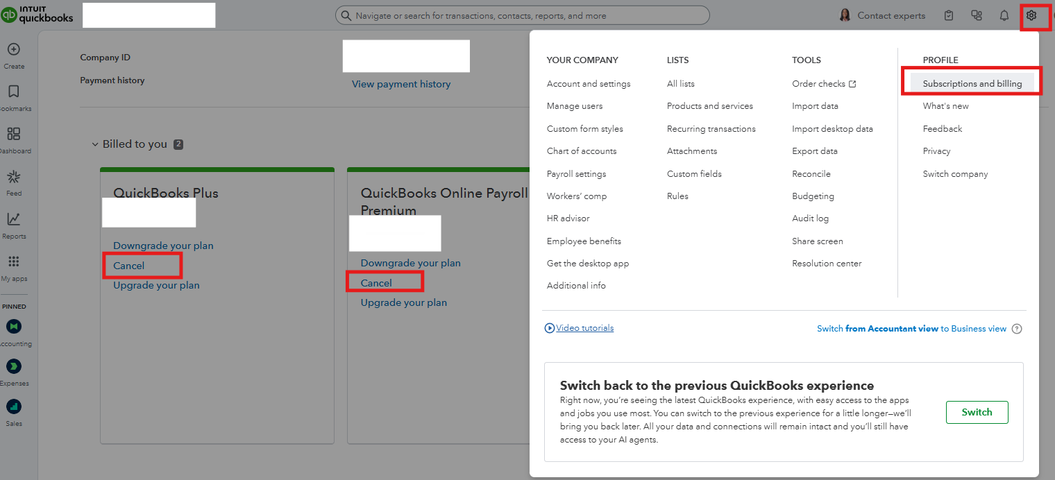 3. In the QuickBooks section, click the Cancel button. If you're cancelling a trial, select Cancel your trial.