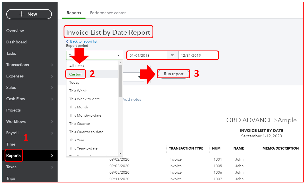 If you're looking for the 2018 and 2019 invoices, you can run the Invoices List by Date report in QuickBooks. This will show you the list of all invoices that you've created. Here's how: