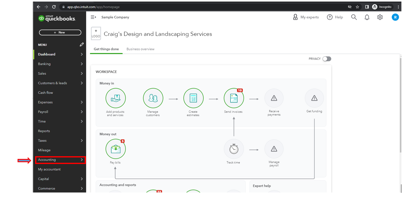 - Go to the Accounting menu, then Chart of Accounts.
