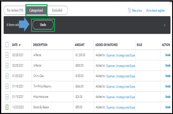 If you've already categorized those transactions, you can undo them instead. This way, they'll go back to the For Review tab and remove them as well.