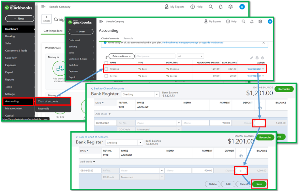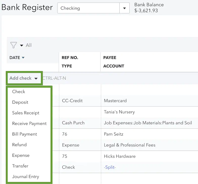 - At the top of the list, please choose what type of transactions you want to add to the account register. Either Add journal entry, Add check, or Add deposit ▼ dropdown menu.