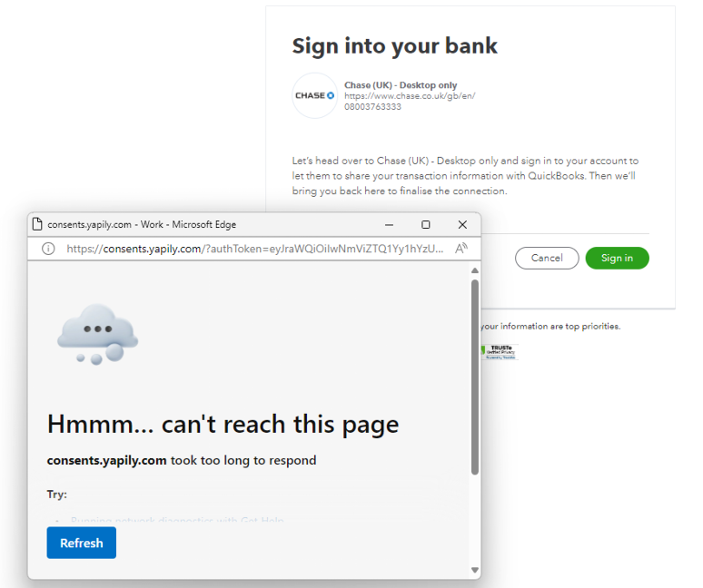 I've done all the above steps. Quickbooks just keeps trying to connect to Chase UK until the link expires. I still can't connect.