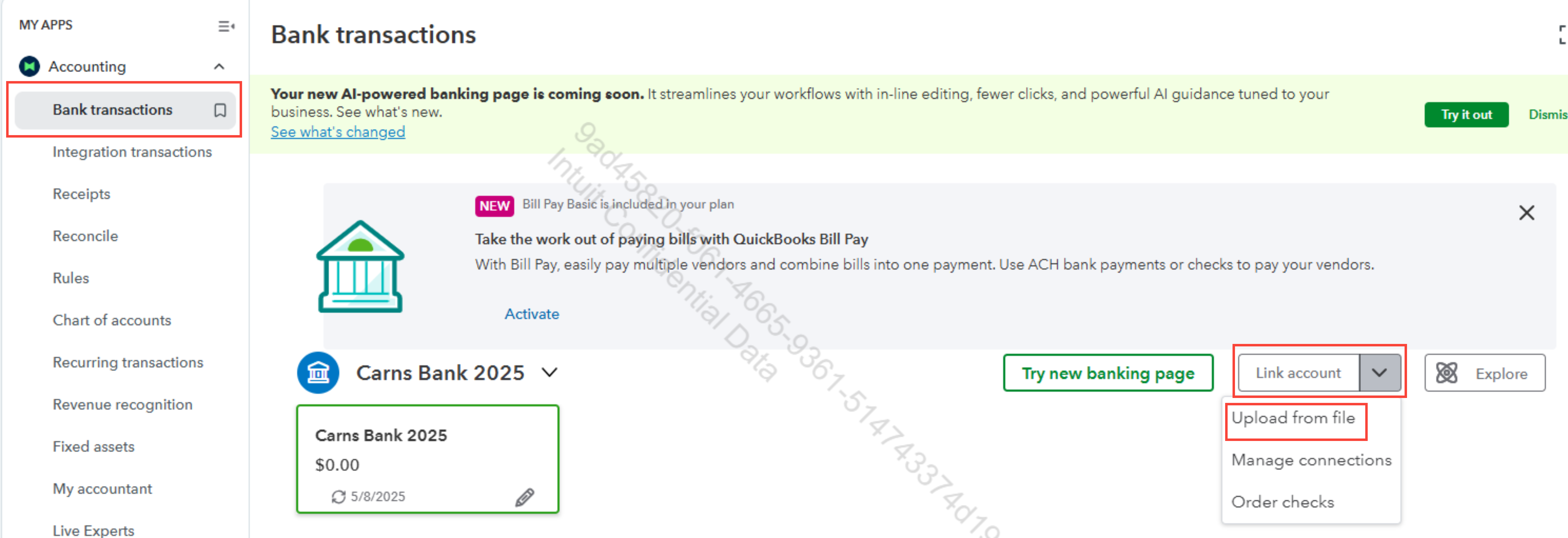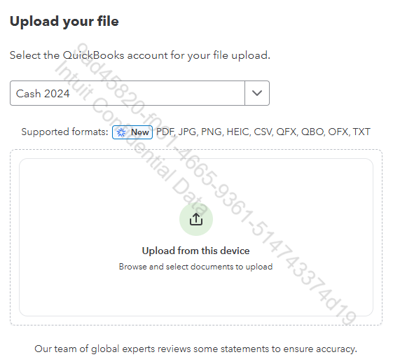 To do this, download your full 2024 bank statement or transaction history from your bank’s website in a CSV file. Ensure that you follow QuickBooks’ CSV formatting guidelines to ensure the file imports smoothly. Once you have the CSV file ready, you can upload it directly into QBO. Here's how:
