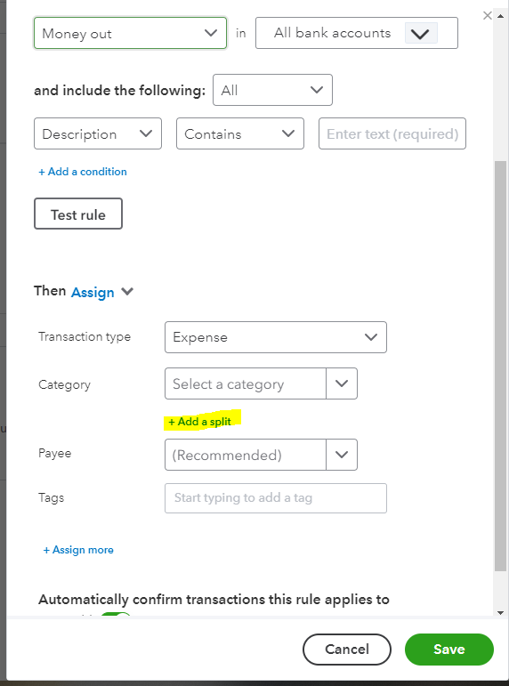 We can create a new rule specific to that transaction to auto-add/match. If you prefer otherwise, we can still manually split it by clicking the transaction and selecting Split transaction. I've added screenshots for your reference.