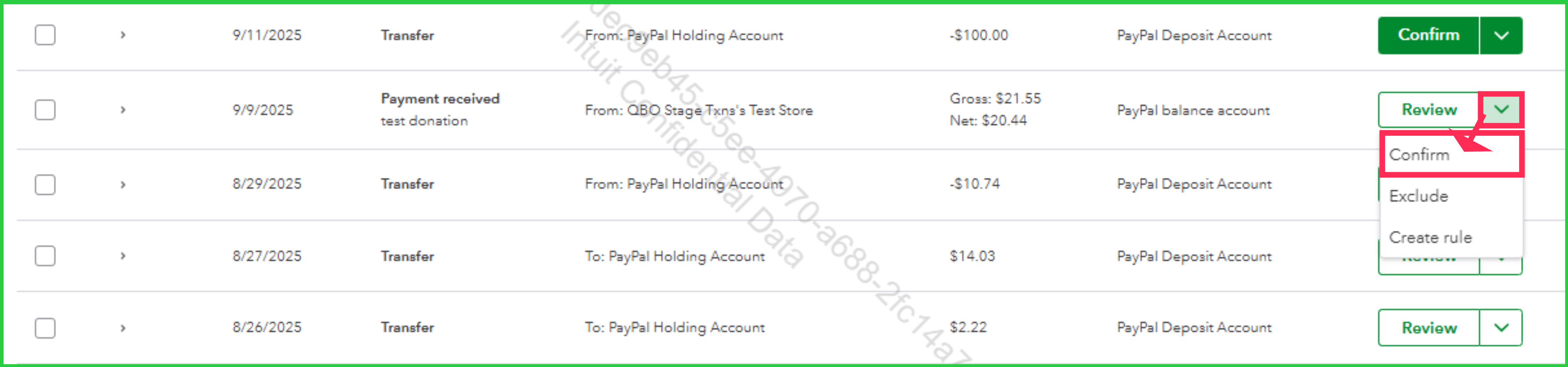 Since QuickBooks matches transaction items to your existing products and services, you can simply select the Confirm option for PayPal payments from the For Review tab.