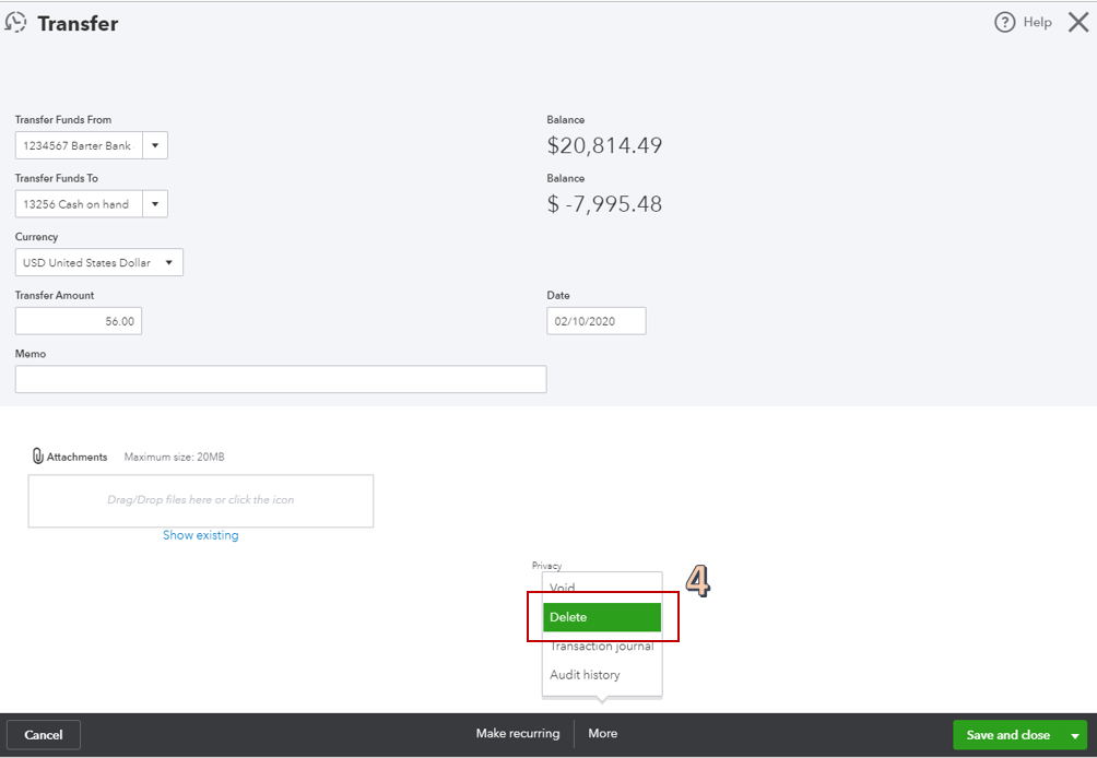 To delete the manually recorded transfer of funds: