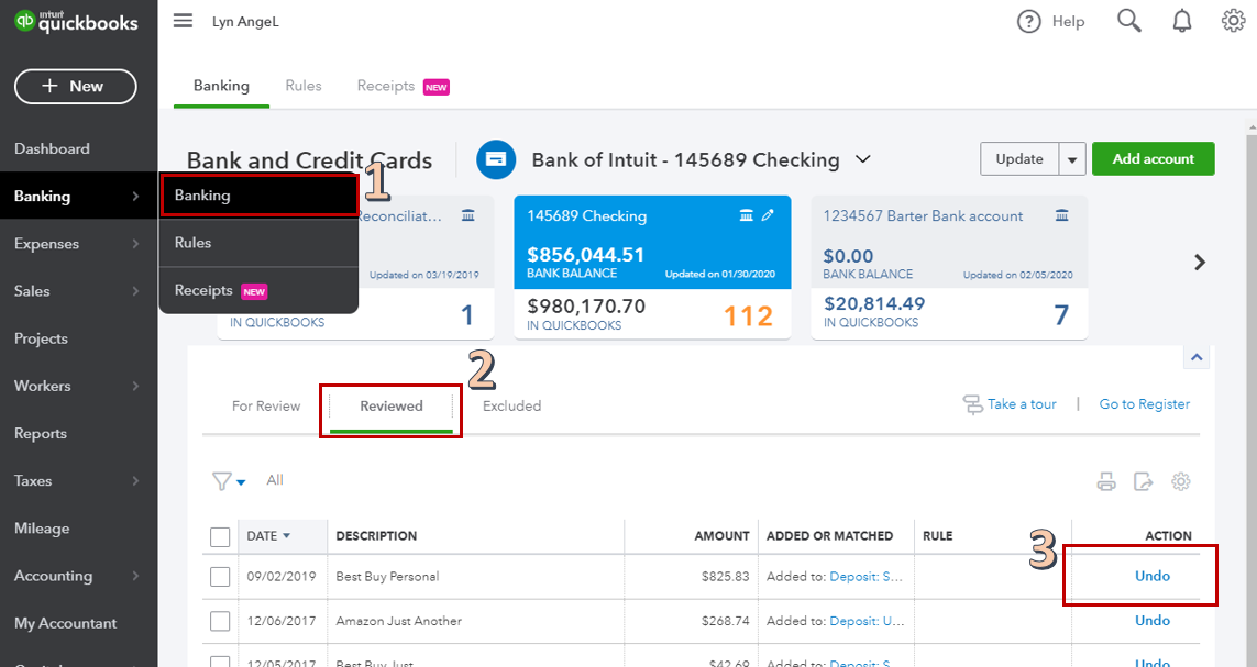 2. Select your bank account under the Banking page, then go to the Reviewed section.