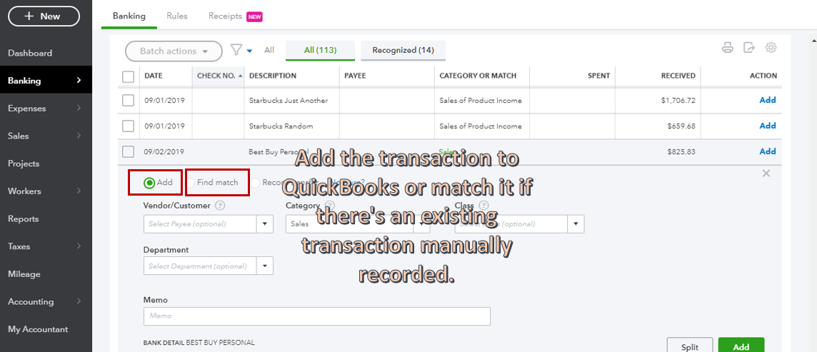 I'll be adding this article as your reference on how to add, match and categorize transactions in QBO: Categorize and match online bank transactions in QuickBooks Online.