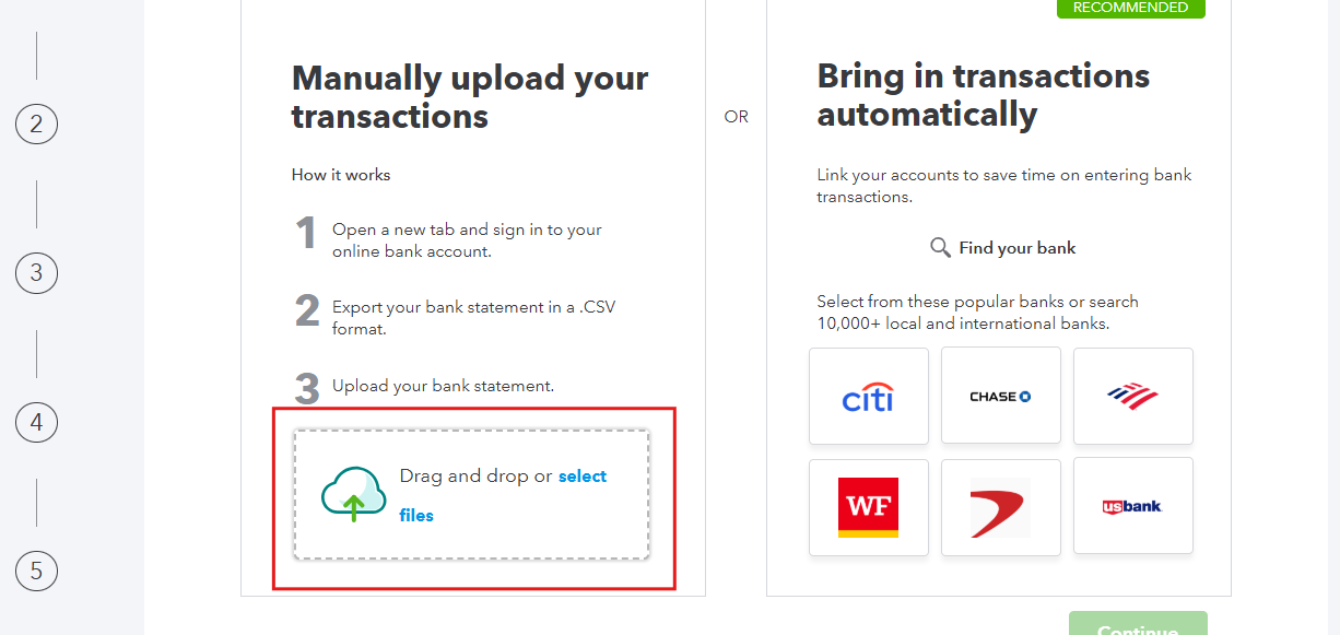 - Choose Drag and drop or select files, then select the file you downloaded from your bank. Click Continue.