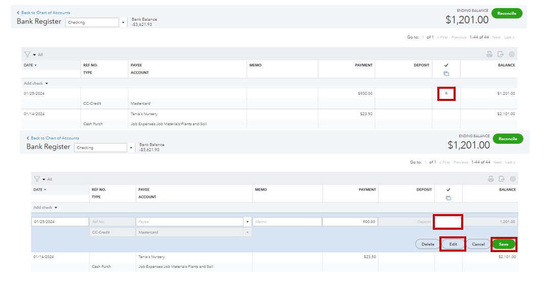 - Return to the bank's register and select the transaction again to manually reconcile (repeatedly click on the blank status until you get R for reconciled).