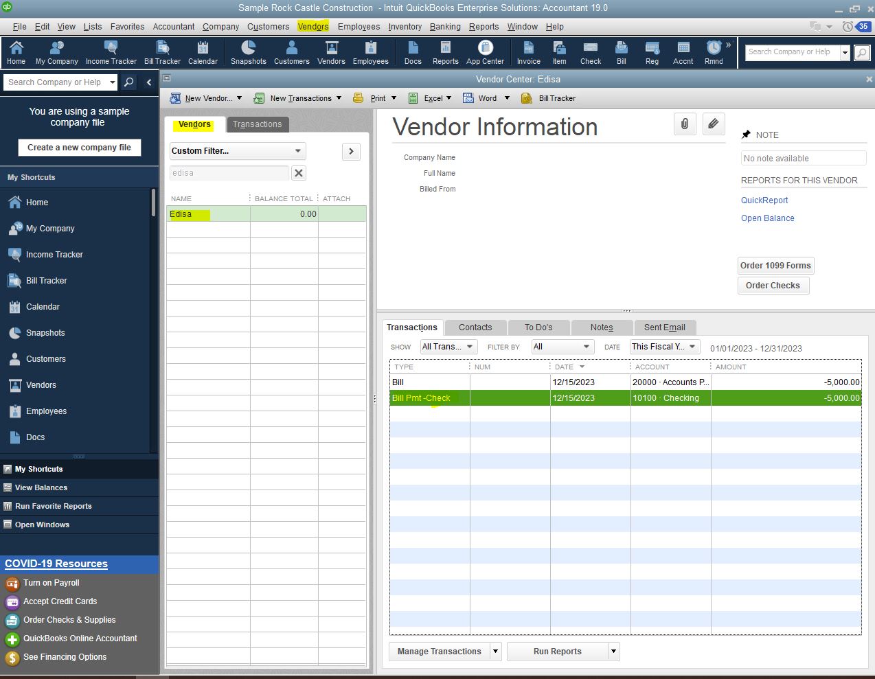 On the other hand, the paid bill shows as a "Bill Pmt-Cheque" type because the payment method used when the time bill is going to pay is a Check. With this, you can go to the Vendor Center and locate the bill payment to verify the payment method used.