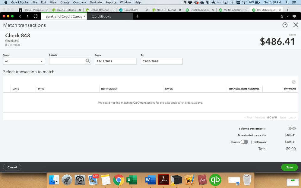I do use the match function a lot for other things like transfers. However, when i am under 'for review' and i select any of the checks that match the payroll JE entries (imported from payroll company), there are no matches found.