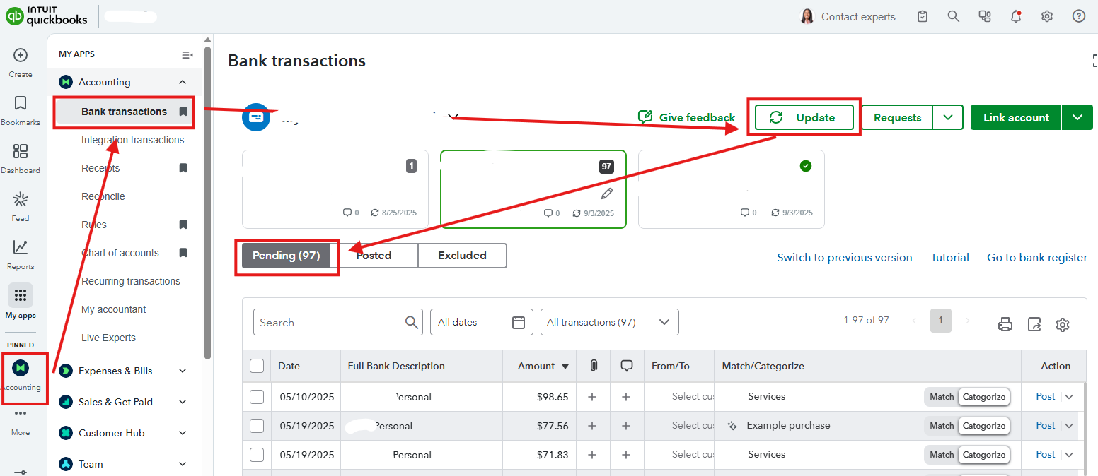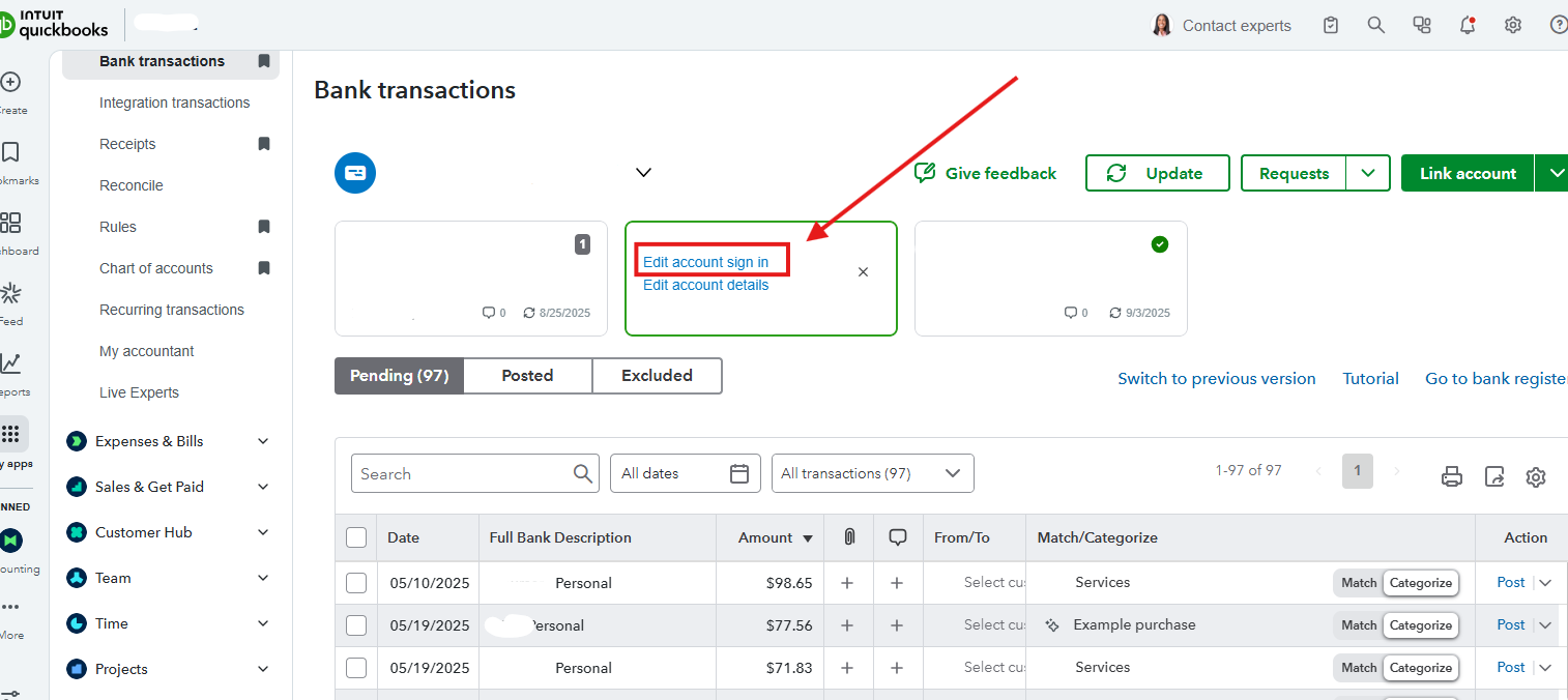 If you cannot find your transactions after reconnecting, we can update your bank connection. Here's how: