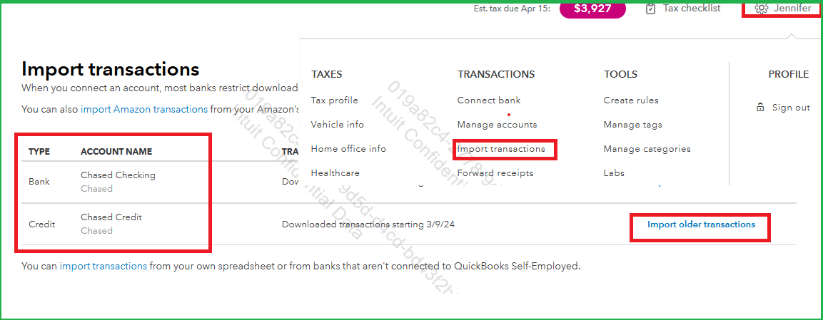 Before that, make sure to export the transactions from your bank and then import them into your QuickBooks Self-Employed account. To do this, head to the Gear icon menu and select Import transactions. From there, locate the bank account that has missing transactions and use the Import older transactions link to upload your file. Then, follow the on-screen steps.