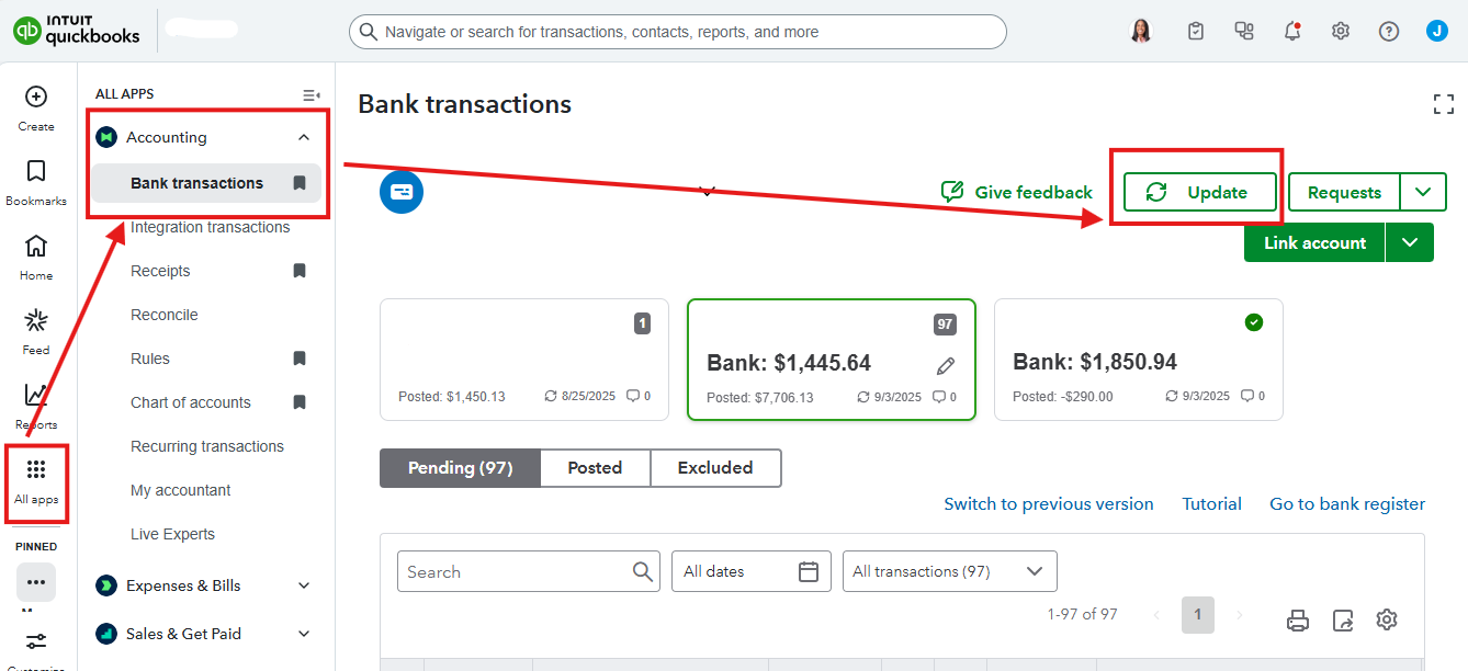 First, let's open a new browser tab and log in to your bank's website to confirm your username and password are correct (not using a saved password), and check for any urgent alerts. Once you've confirmed, log in to your bank's website and head back to your QuickBooks account. Update the banking page to refresh the connection. Here's how: