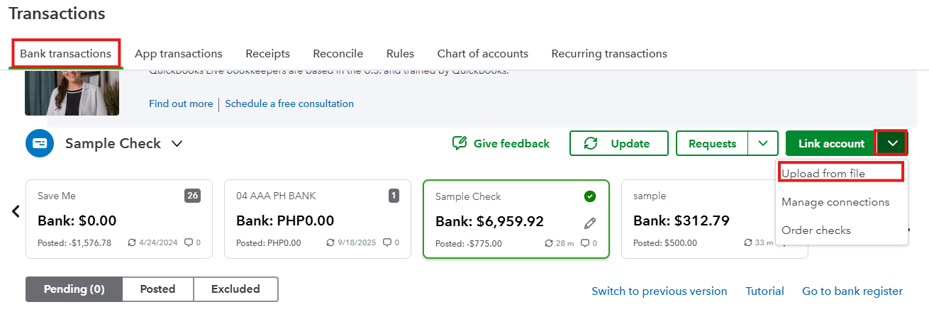 For further guidance, visit this resource: Manually upload transactions into QuickBooks Online.