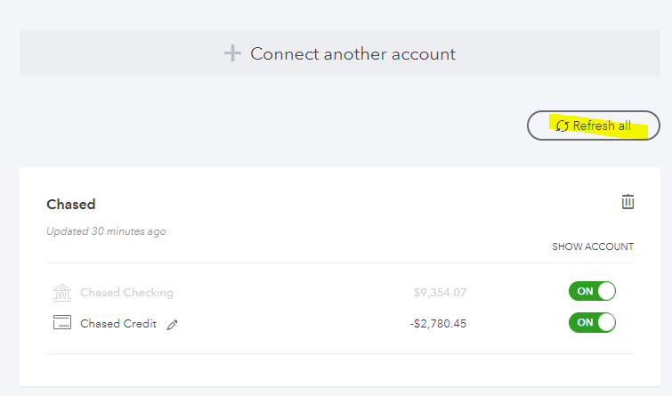 If the transactions appear in the private browser session, you can return to using your regular browser and clear the cache (please don't perform clearing cookies). However, if the issue persists, you can manually update the connection by selecting the Refresh all button. This will trigger your books to fetch the latest transactions from your Cathay Bank account. Here's how: