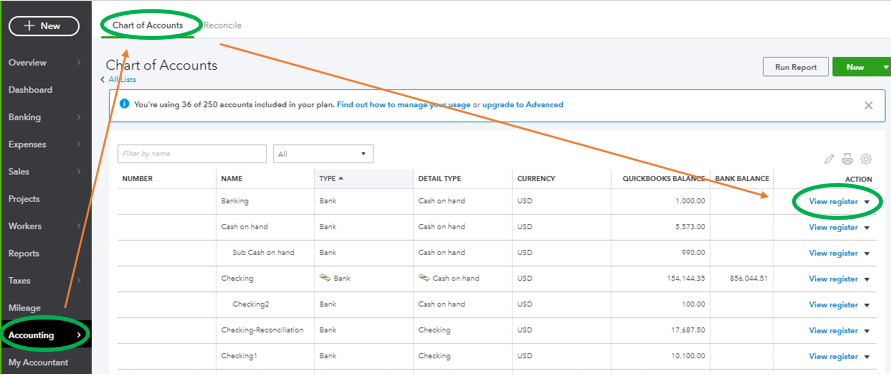 - In QBO, go to the Accounting menu at the left pane to get to the Chart of Accounts.