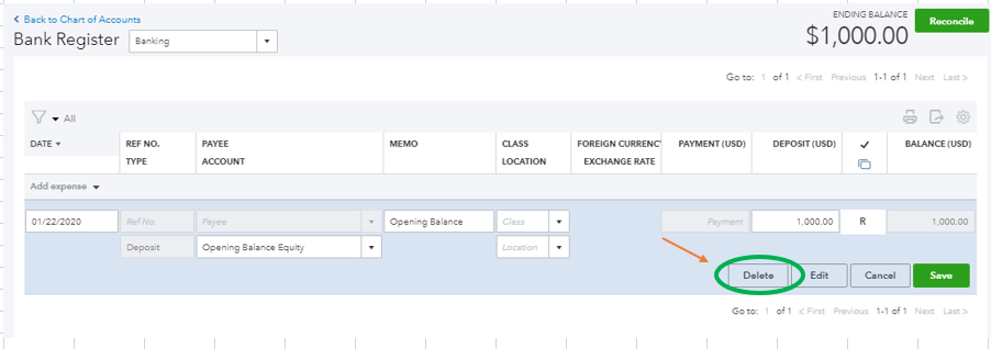 - Select the opening balance, then click Delete.