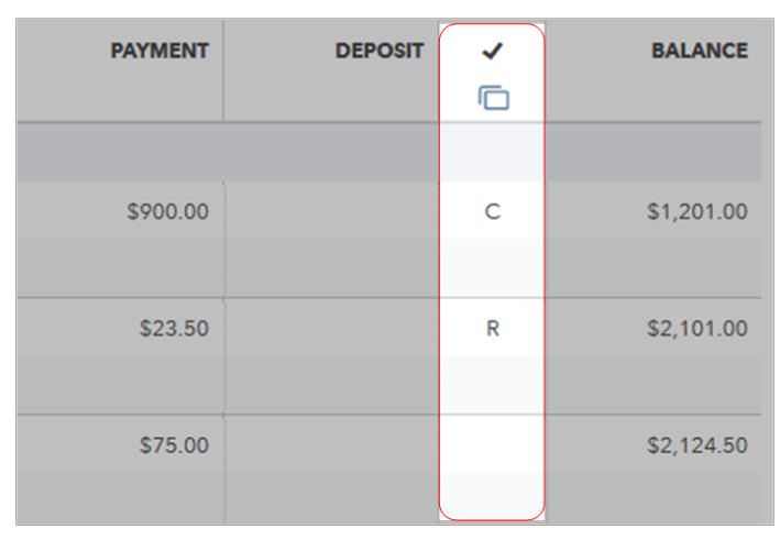 - Review the check column. If the transaction is reconciled, you’ll see an “R” (see attached images below).