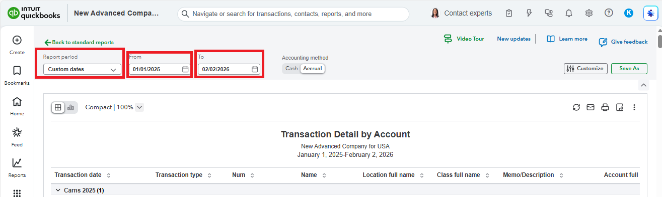 Instead of using the Last 12 months option in the Report period, select the Custom dates and set the start date to January 1, 2025, and the end date to today. Using a custom date range gives you precise control over the period shown in your report, so you only include the transactions you actually want to analyze.