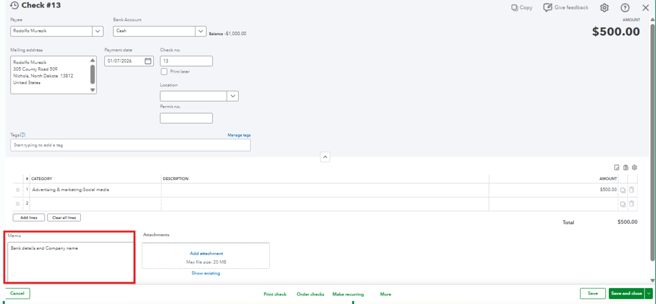 QuickBooks Online (QBO) itself does not have built-in functionality to print the MICR line (Magnetic Ink Character Recognition) for checks. It can only generate standard checks showing the check number, payee details, and your company address. If you want to include additional information, such as bank details or your company name, you can use the Memo field when creating the check.