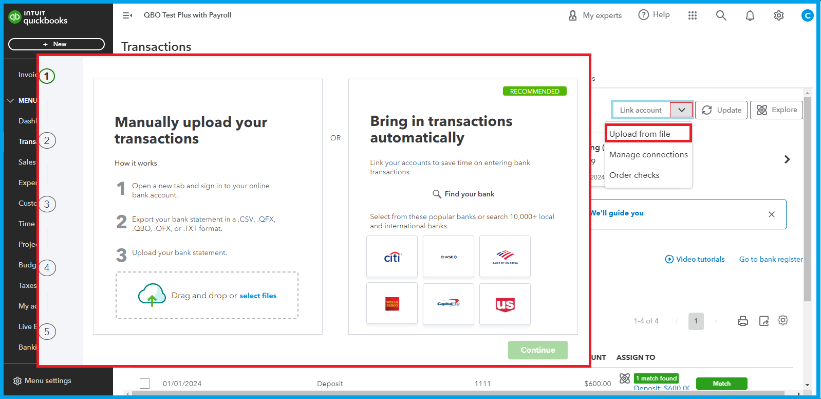 In the meantime, consider manually uploading your Apple Card transaction through a CSV file. Make sure to review the file format and size to prevent any issues along the process. Once done, choose the Upload from file under the Link account dropdown on the Bank Transactions page.