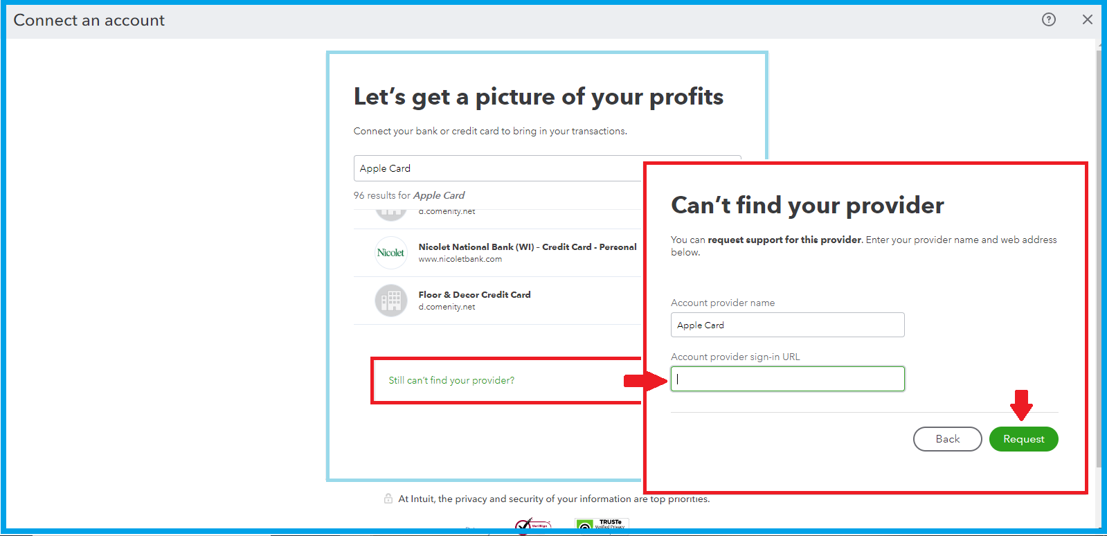 Please know that connecting Apple cards in QuickBooks Online is unavailable. In this case, you may request to add it to our list of supported banks. This process may take some time as our developers will review it. I'll show you how: