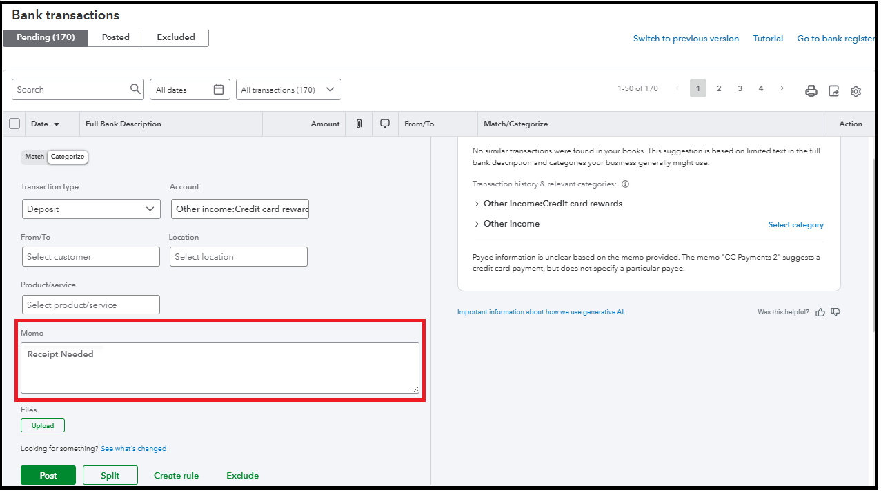 However, please note that they do not appear in the bank feeds. You can manually add notes like "Receipt Needed" in the Memo field to flag the synced expense transactions effectively.