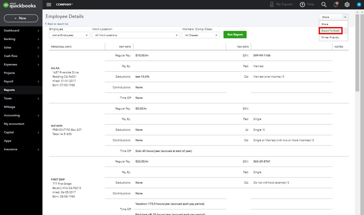 I recommend you use the Employee Details report in QuickBooks. This report shows detailed information about your employees like the SSN and other information.