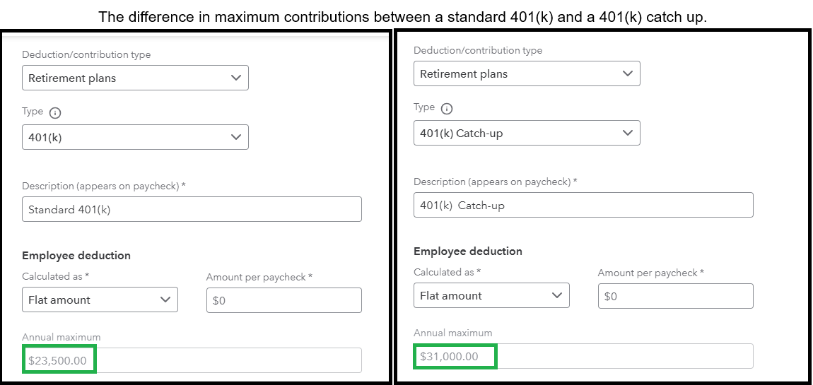 Please know that the system will not automatically adjust the standard contribution limit to include the catch-up amount. To ensure the correct maximum contribution is applied, I recommend deleting the current 401(k) deduction and creating a new 401(k) deduction specifically for the catch-up contribution once the employee turns 50 years old. For now, since the employee is still 49 years old, you can continue using the standard 401(k) contribution.
