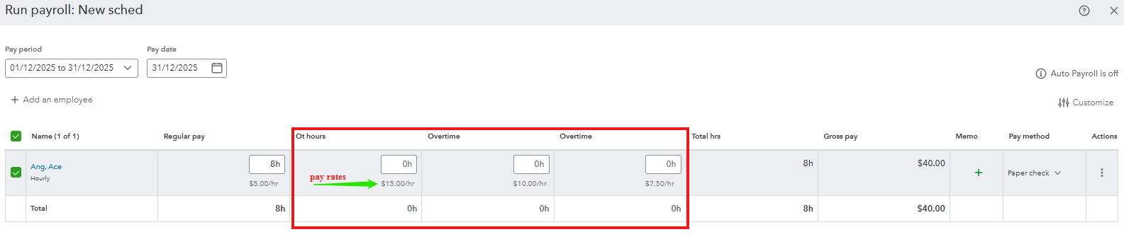 The new pay type will automatically appear as a column when running payroll. You can then enter the overtime hours worked for each employee in that column, and QuickBooks will calculate the correct pay based on the rate you entered.