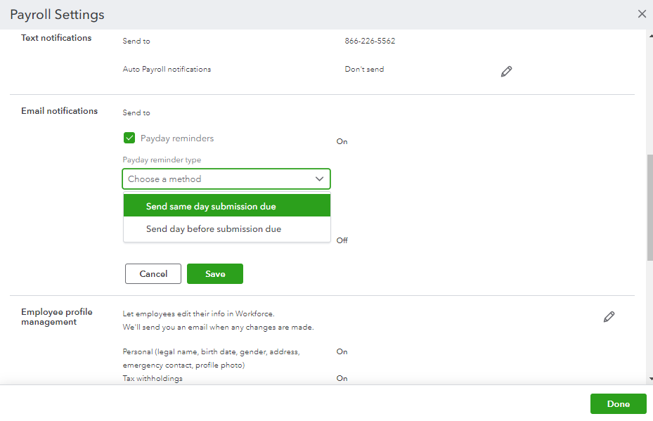 Regarding the payroll reminder, if you're processing payroll through direct deposit, QuickBooks will normally send you an email notification two days before the payroll submission. You can also set up and choose a specific payday reminder in your payroll settings.
