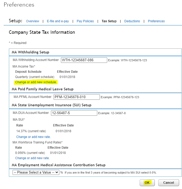 Also, QuickBooks supports some deposit schedules. If yours isn't supported, then you'll have to pay electronically through your state website.