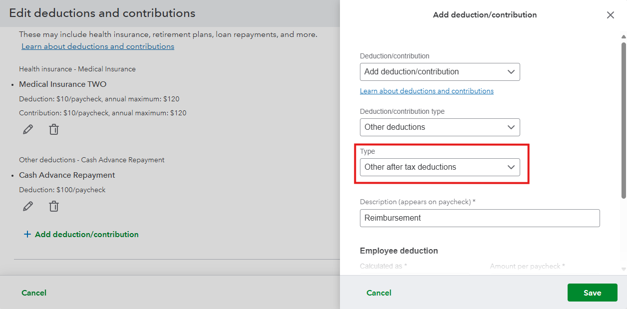 Additionally, I'd like to clarify that your Reimbursement item in the Payroll system should be an Other after-tax deductions type, so it will not affect the taxes. You can check the sample below: