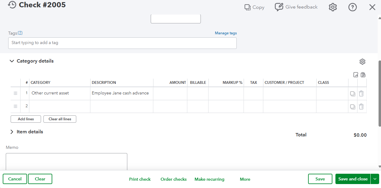 As a workaround, you can issue your employee a regular check and utilize the Other Current Asset account you created in the Category details section. You can also add a description in the description field stating Employee Advance.
