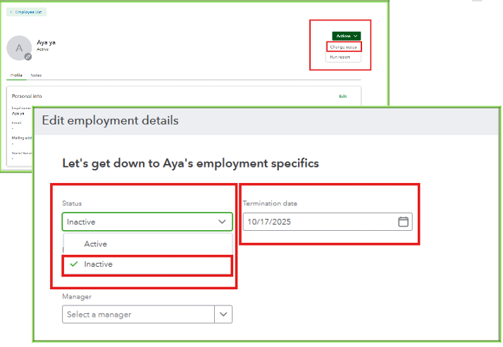 If you're using QuickBooks Time integrated with QuickBooks Online or Desktop, ensure to deactivate the employee in QuickBooks as well to avoid synchronization issues.