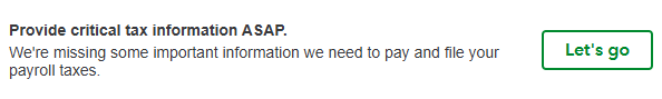 The message "Provide critical tax information ASAP. We're missing some important information we need to pay and file your payroll taxes" on your Payroll Overview page means that specific tax details are required to enable online payments and filing.