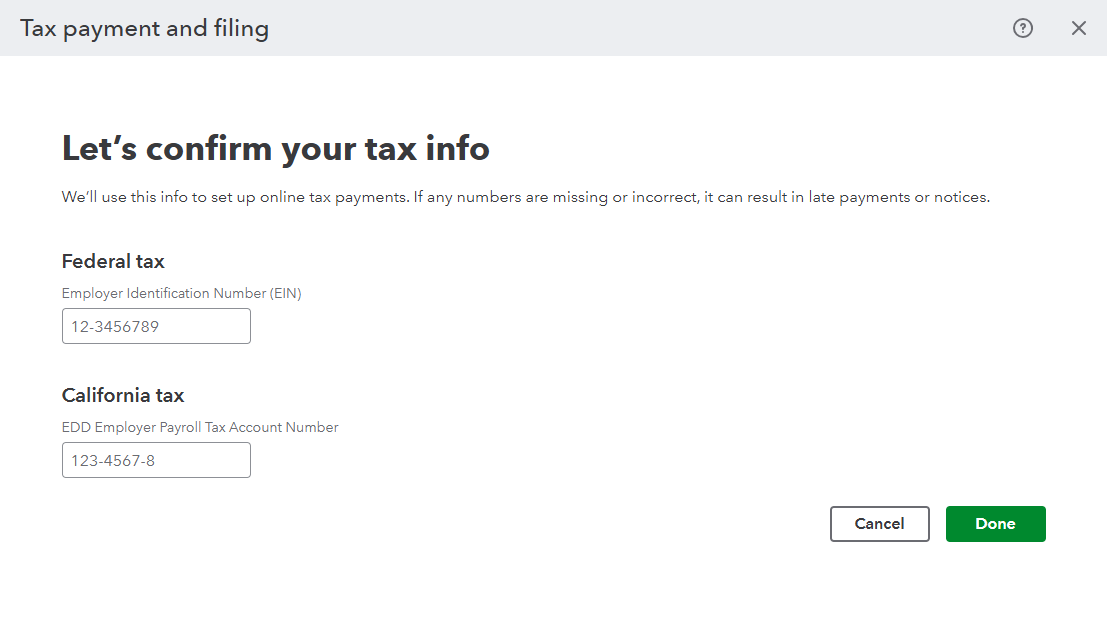Once you've confirmed or entered the correct tax IDs, click Done to complete the setup and enable online tax payments.
