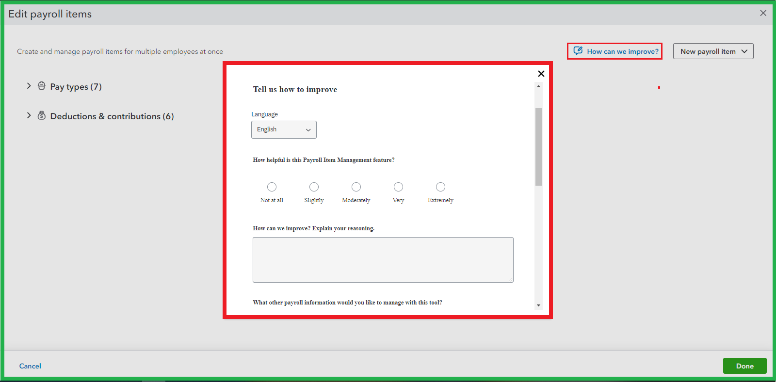 I understand the importance of eradicating the items that may cause any confusion. You'll want to submit a feature request to our Product Developers. We can do so on the Edit payroll items page. On the left corner, select the How can we improve?