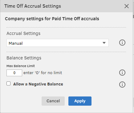 When you switch your time-off settings to Manual, the system will no longer automatically accrue time off hours for you. This means that any time off hours you wish to accumulate will need to be manually entered by either a user or administrator.