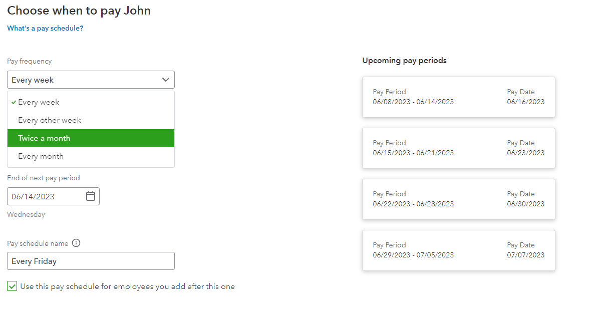 Before anything else, are you referring to your employees' pay period schedule? If so, I have here some insights to share about your query. In QuickBooks Online (QBO) Payroll, although you can change your payroll schedule to Twice a month, however, it's not possible to set the dates to the 1st and 31st of the month. You can only set the payday period to 20 days between the 1st and the 2nd period.